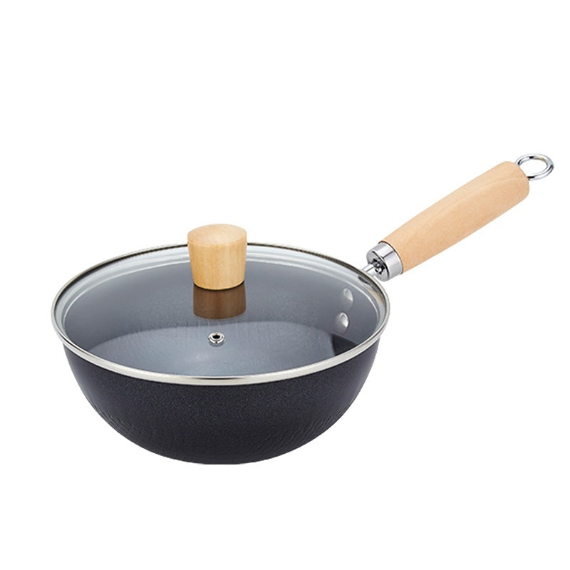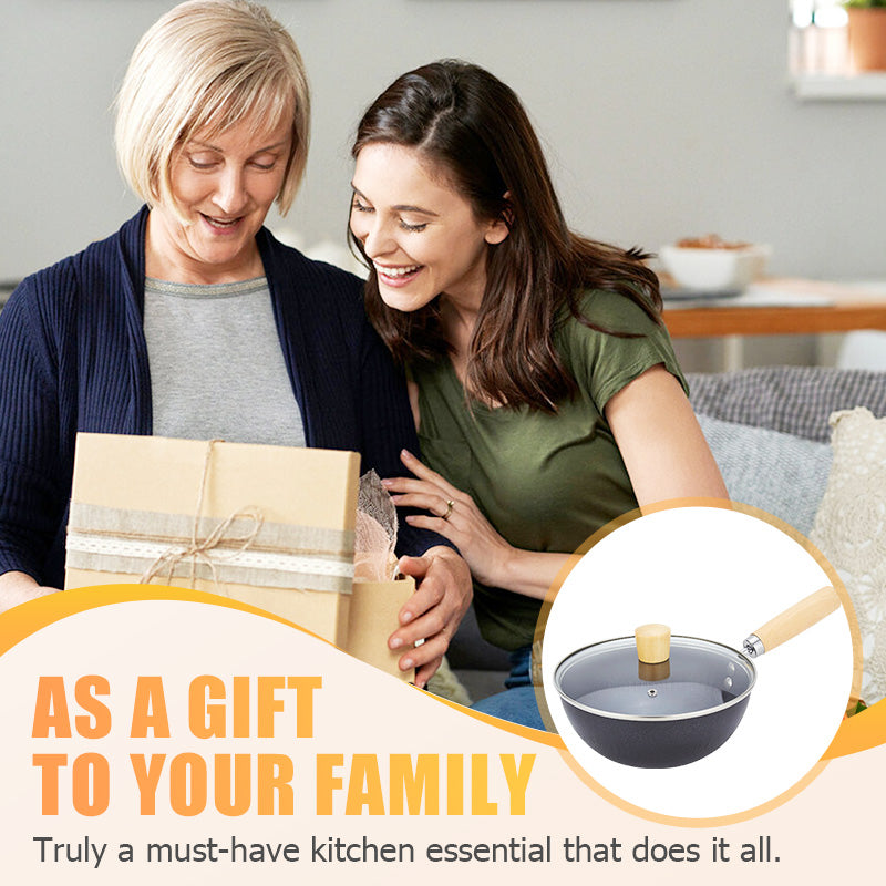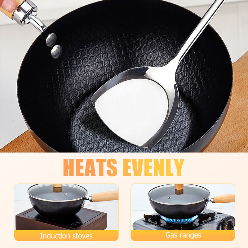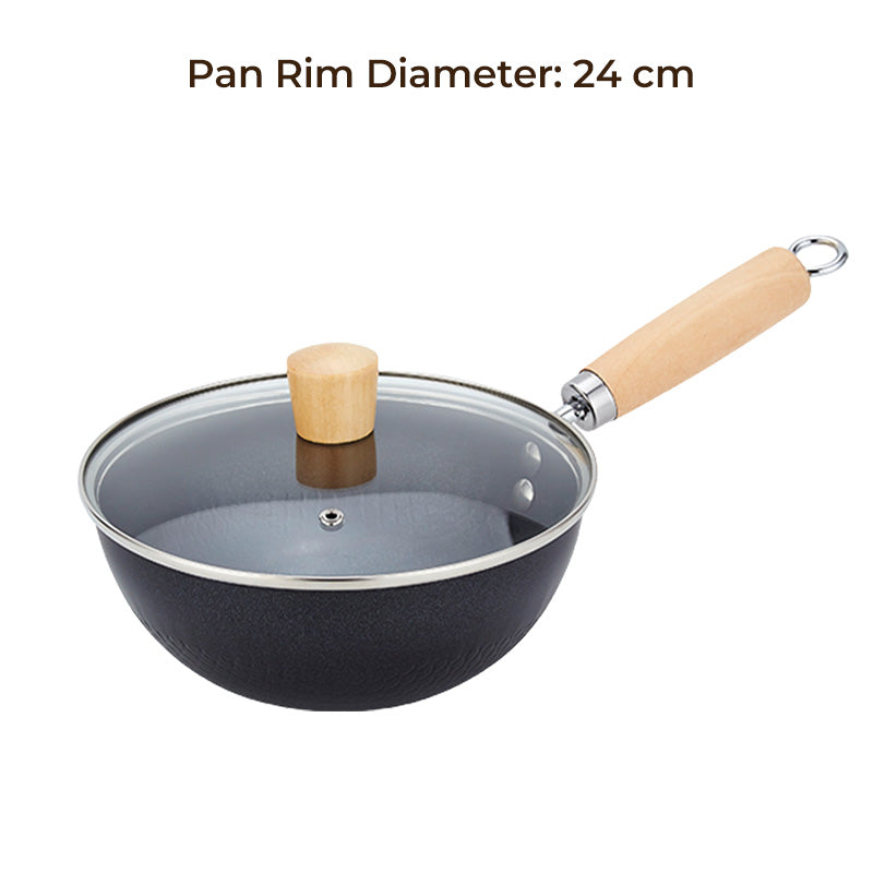 LEHKÁ ERGONOMICKÁ RUKOJEŤ – Pánev je lehká a vybavena ergonomickou dřevěnou rukojetí pro pohodlný a bezpečný úchop. Její promyšlený design umožňuje snadnou manipulaci a manévrovatelnost, díky čemuž jsou dlouhé vaření bez námahy a příjemné.