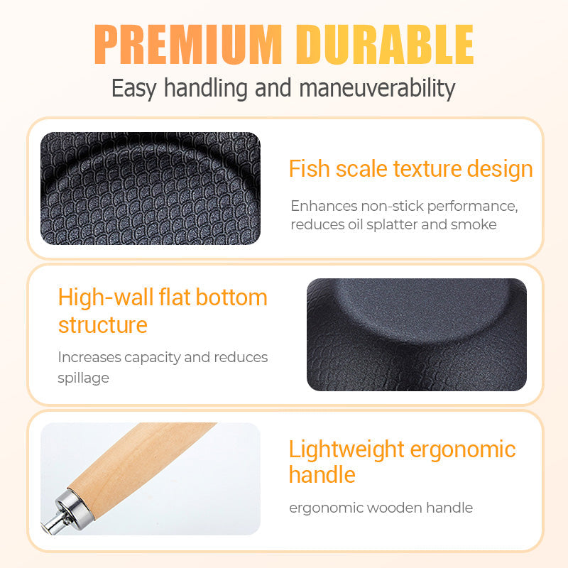 NEPŘILNAVÝ DESIGN S TEXTUROU RYBÍCH ŠUPIN – Vnitřní stěny a dno pánve mají unikátní vzor rybích šupin, který zlepšuje nepřilnavost, snižuje rozstřik oleje a kouř a zajišťuje rovnoměrné vaření.