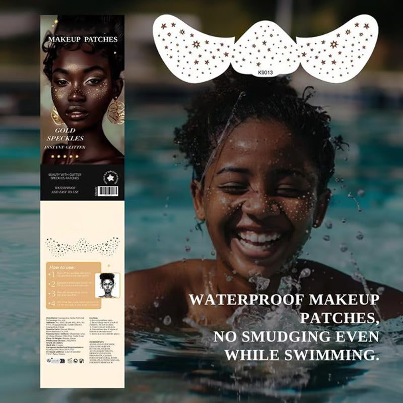 VAIVATON HAKEMUS - Helppokäyttöisiksi suunniteltuja glitter-pisama-tatuointeja voidaan levittää saumattomasti ilman ammattimaisia meikkitaitoja.