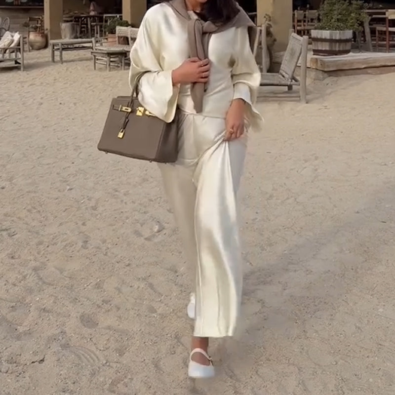 Zīdains un elegants satīna bikšu komplekts ar platu kaklu, garām piedurknēm ar brīvu augšdaļu un elastīgu vidukli.
